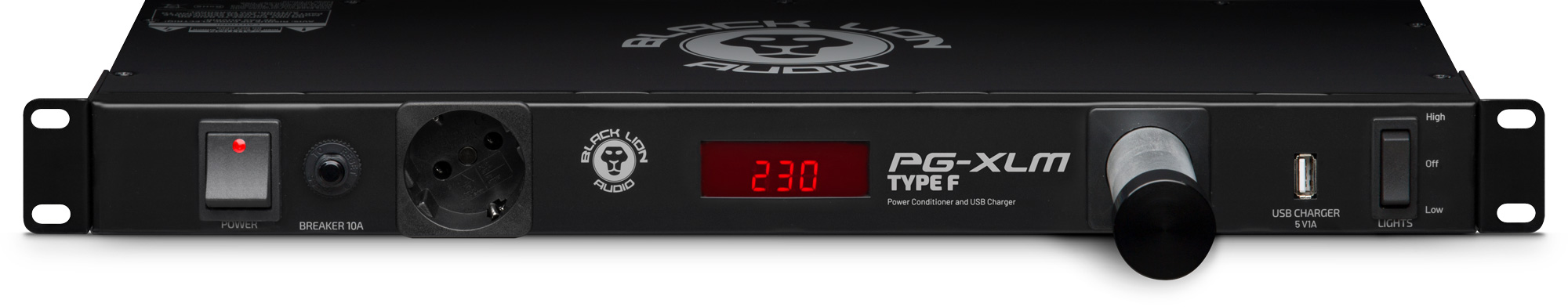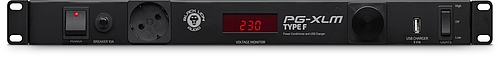 PG-XLM Type F Power Conditioner für die Rackmontage mit PG-90-Filtertechnologie, Panasonic- und Wima-Kondensatoren, sechs geschalteten, gefilterten und überspannungsgeschützten Steckdosen auf der Rückseite, einer geschalteten Komfortsteckdose auf der Vorderseite, Echtzeit-Spannungsanzeige, eine ausziehbare Lampe und ein vorderseitiger USB-Anschluss zum Aufladen von Geräten.