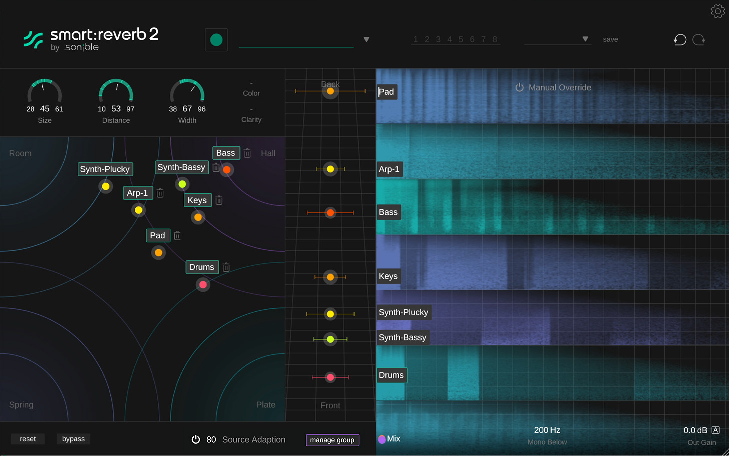 smart:reverb 2 ist ein adaptives Reverb-Plug-in, das intelligente Signalverarbeitung mit neuartiger Multi-Track-Integration kombiniert und so eine intuitive Arbeit mit Nachhall ermöglicht – egal ob auf Einzelspuren oder im gesamten Arrangement. Der neue Group Mode erlaubt es, dass mehrere Instanzen miteinander kommunizieren und Daten austauschen. So können Tiefenstaffelung und räumliche Balance im gesamten Projekt mühelos umgesetzt werden.